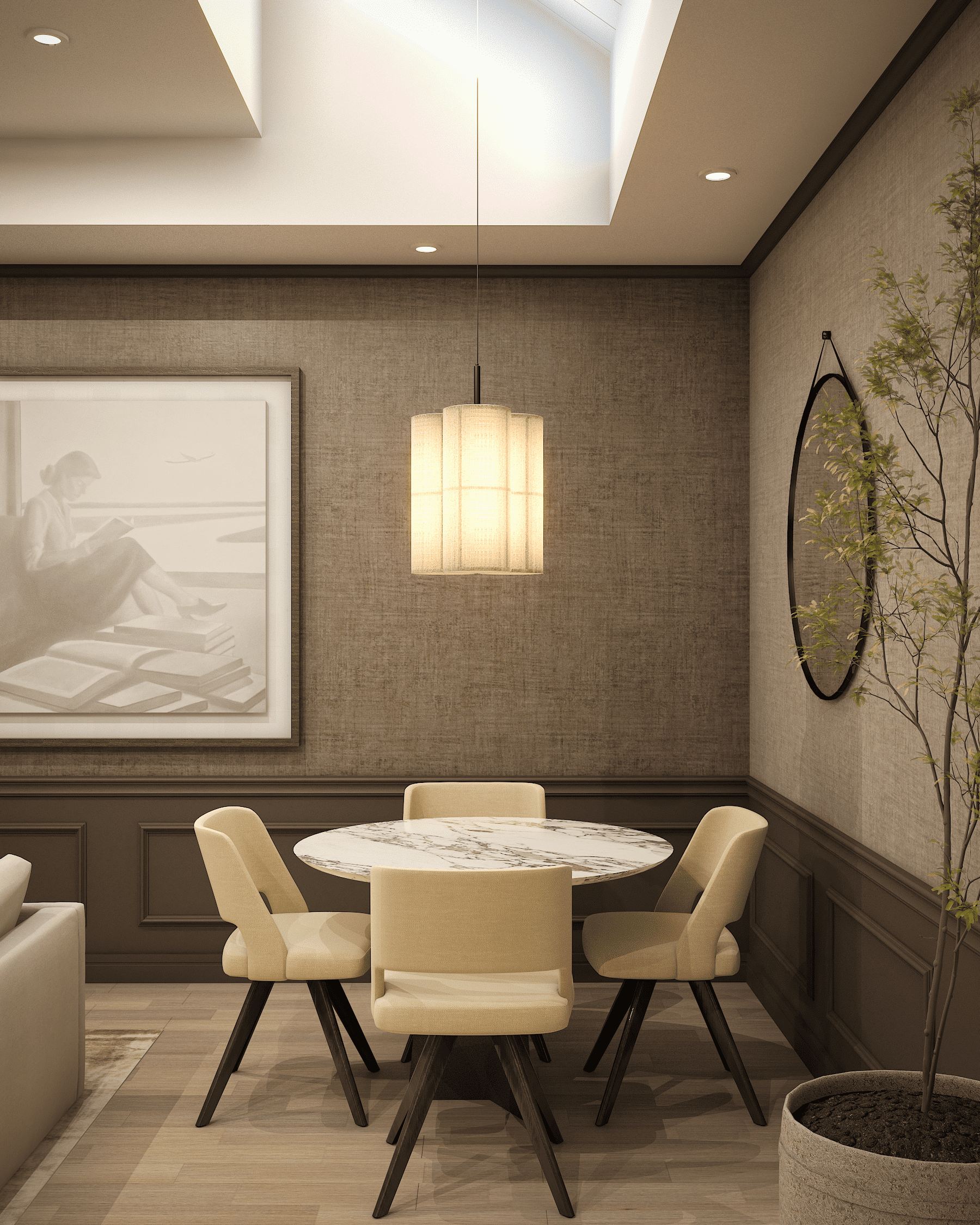 Cada espacio se enriquece con una selección curada de materiales y texturas, donde conviven superficies clásicas y acabados contemporáneos. El mobiliario y el arte se eligieron con la misma atención al detalle, creando un conjunto armónico que refleja carácter y sofisticación.